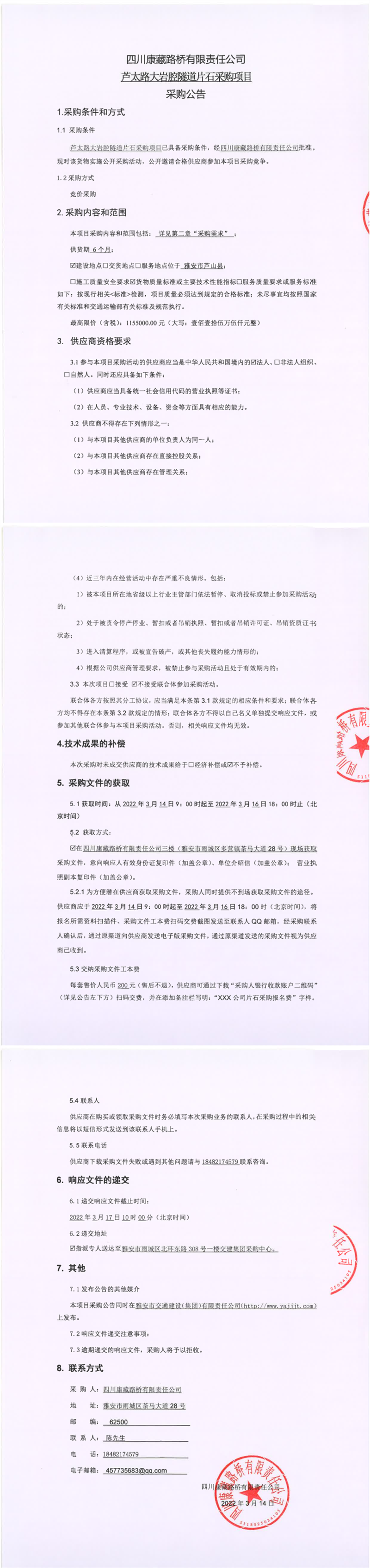 四川康藏路橋有限責(zé)任公司蘆太路大巖腔隧道片石采購項(xiàng)目采購公告