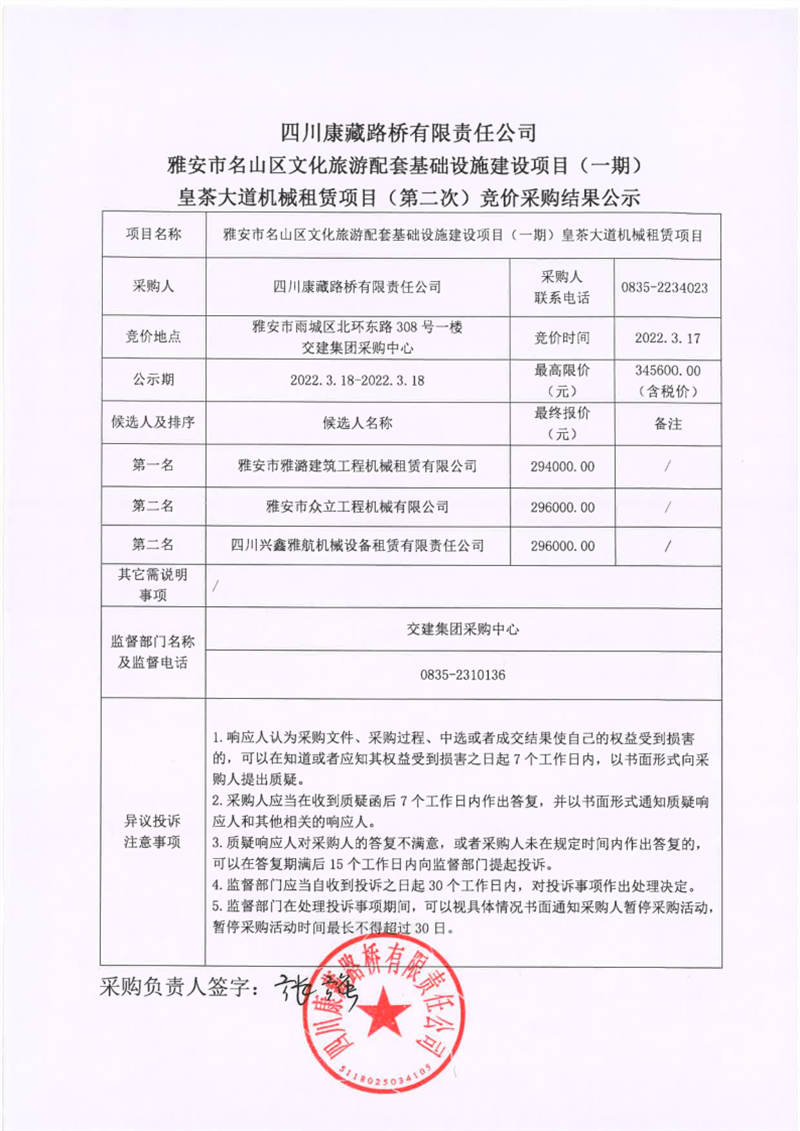 四川康藏路橋有限責(zé)任公司雅安市名山區(qū)文化旅游配套基礎(chǔ)設(shè)施建設(shè)項(xiàng)目(一期)皇茶大道機(jī)械租賃項(xiàng)目(第二次)競價(jià)采購結(jié)果公示