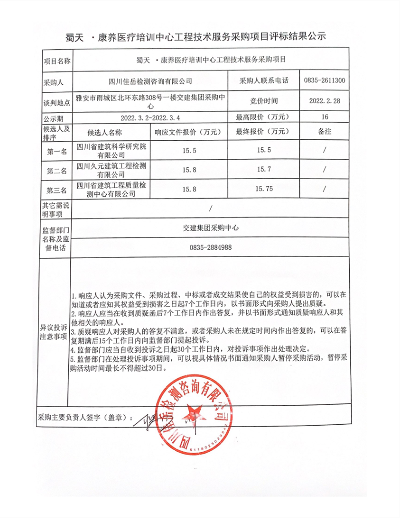 四川佳岳檢測(cè)咨詢(xún)有限公司蜀天.康養(yǎng)醫(yī)療培訓(xùn)中心工程技術(shù)服務(wù)采購(gòu)項(xiàng)目評(píng)標(biāo)結(jié)果公示