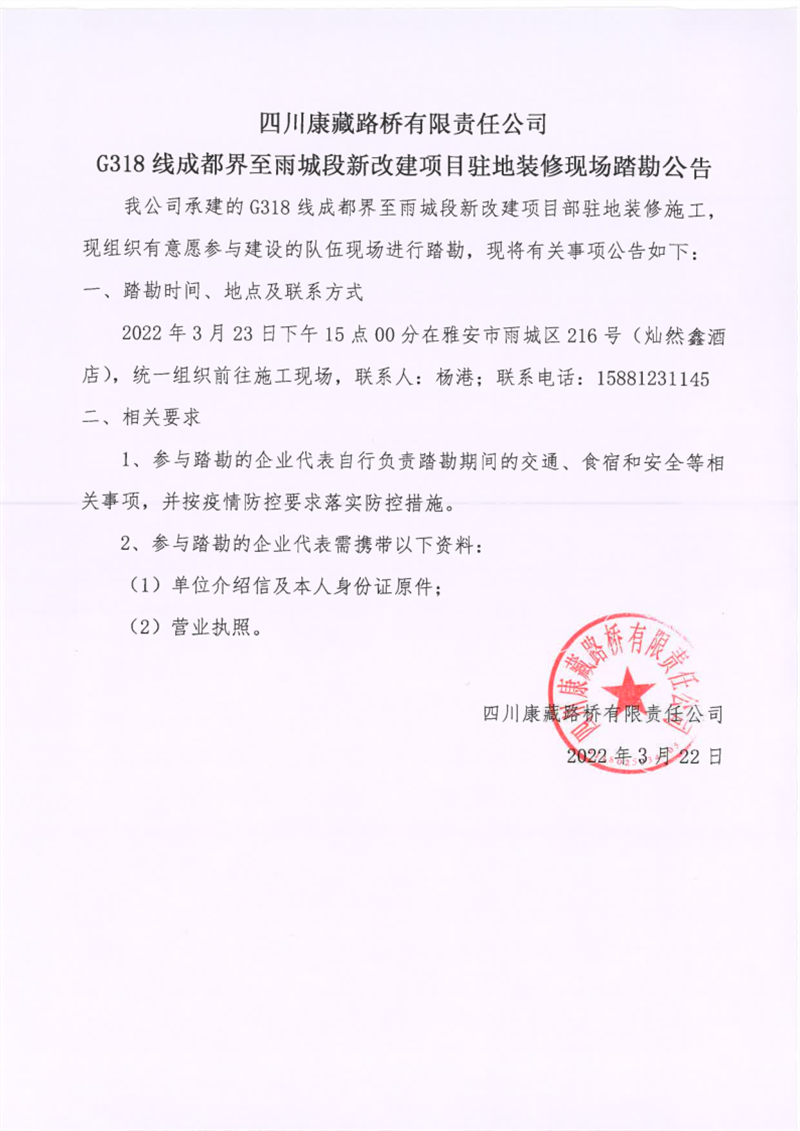 四川康藏路橋有限責(zé)任公司G318線成都界至雨城段新改建項(xiàng)目駐地裝修現(xiàn)場(chǎng)踏勘公告