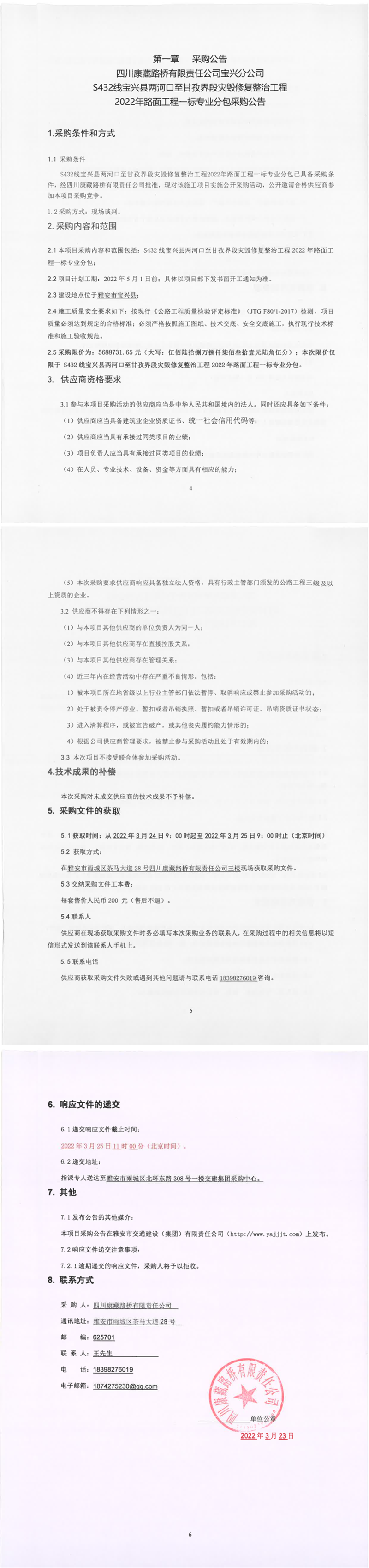 四川康藏路橋有限責任公司S432線寶興縣兩河口至甘孜界段災毀修復整治工程2022年路面工程一標專業(yè)分包采購公告