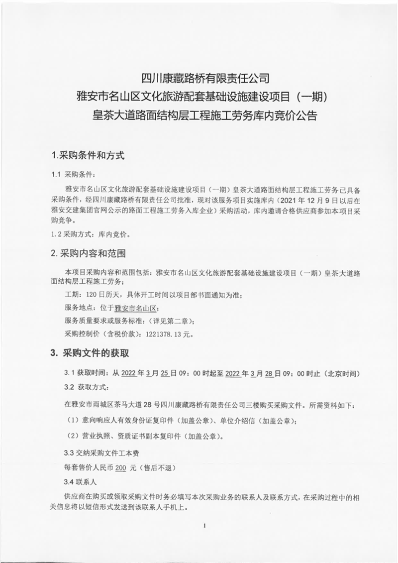 四川康藏路橋有限責(zé)任公司雅安市名山區(qū)文化旅游配套基礎(chǔ)設(shè)施建設(shè)項(xiàng)目(一期)皇茶大道路面結(jié)構(gòu)層工程施工勞務(wù)庫內(nèi)競價公告