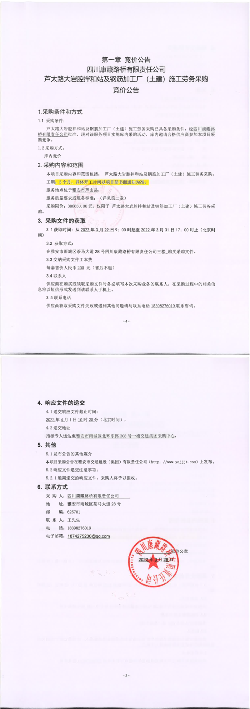 四川康藏路橋有限責(zé)任公司蘆太路大巖腔拌和站及鋼筋加工廠(土建)施工勞務(wù)采購競價(jià)公告