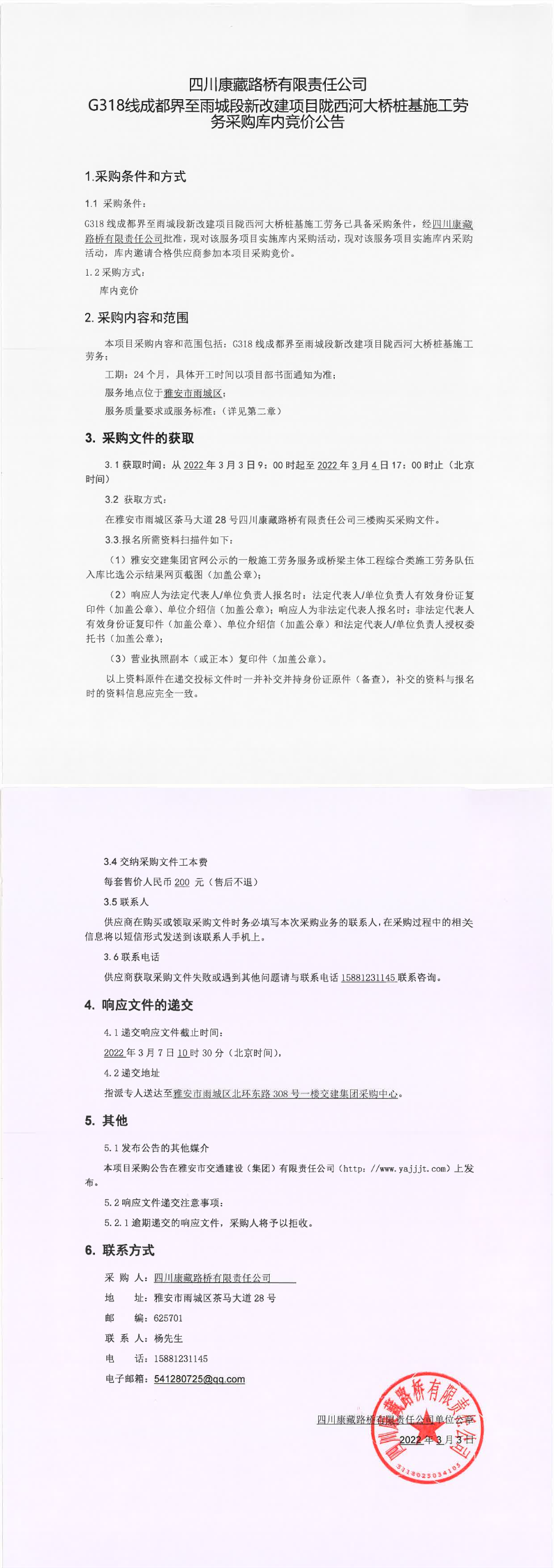 四川康藏路橋有限責任公司G318線成都界至雨城段新改建項目名山河大橋樁基施工勞務采購庫內競價公告