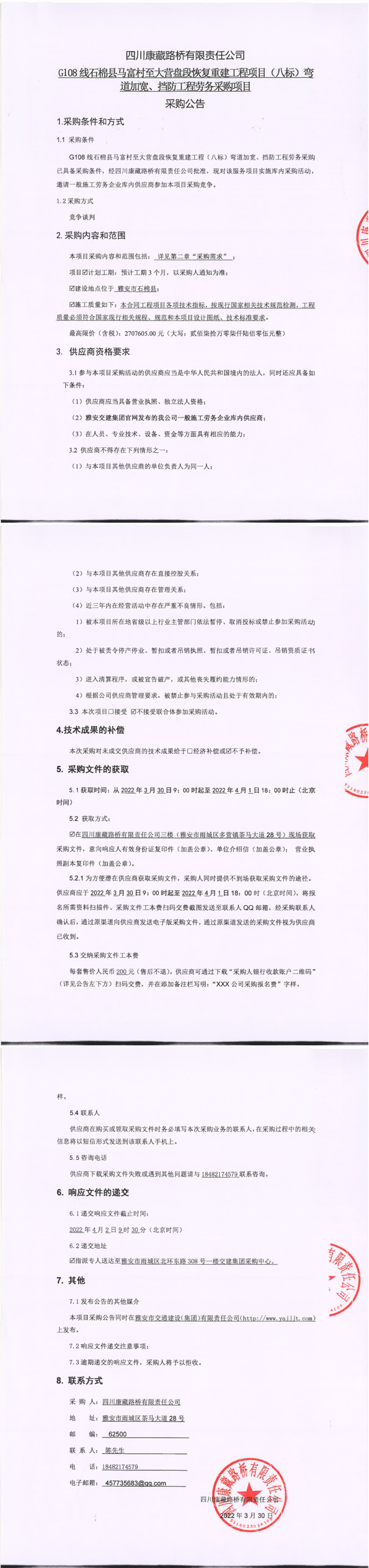 四川康藏路橋有限責(zé)任公司G108線石棉縣馬富村至大營(yíng)盤段恢復(fù)重建工程(八標(biāo))彎道加寬、擋防工程勞務(wù)采購(gòu)項(xiàng)目采購(gòu)公告