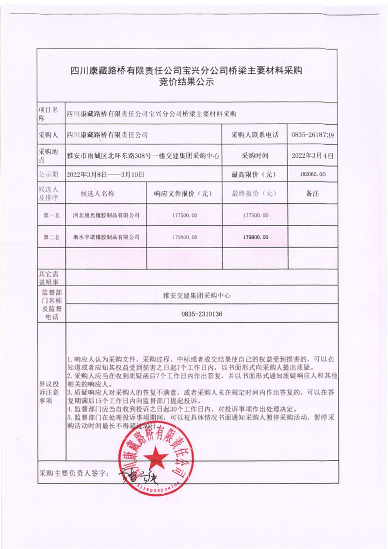 四川康藏路橋有限責(zé)任公司寶興分公司橋梁主要材料采購(gòu)競(jìng)價(jià)結(jié)果公示