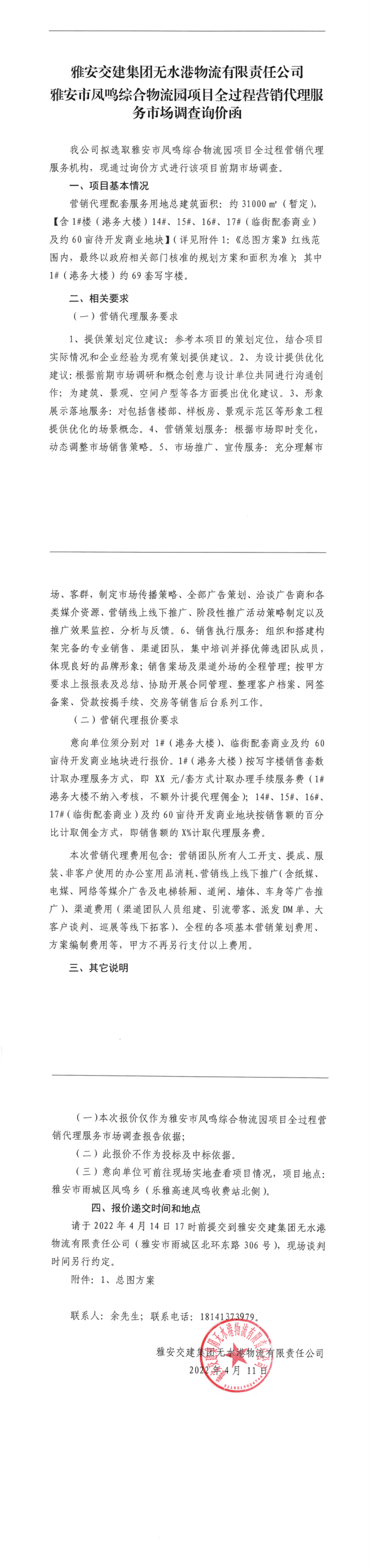 雅安交建集團無水港物流有限責任公司雅安市鳳鳴綜合物流園項目全過程營銷代理服務(wù)市場調(diào)查詢價函