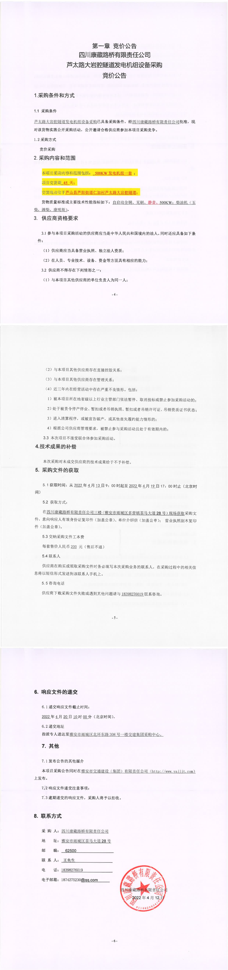四川康藏路橋有限責任公司蘆太路大巖腔隧道發(fā)電機組設備采購競價公告