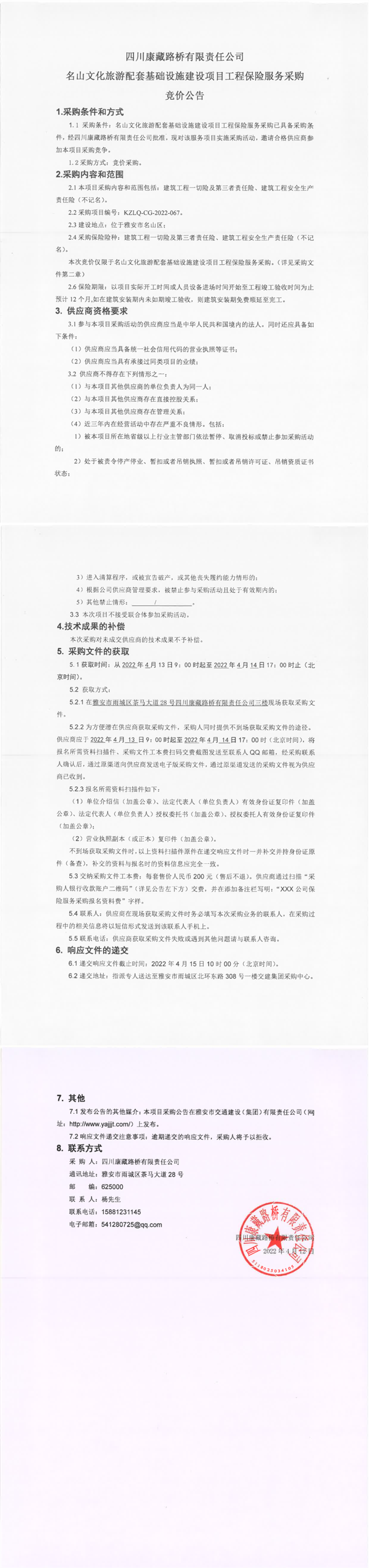 四川康藏路橋有限責(zé)任公司名山文化旅游配套基礎(chǔ)設(shè)施建設(shè)項(xiàng)目工程保險(xiǎn)服務(wù)采購競價(jià)公告