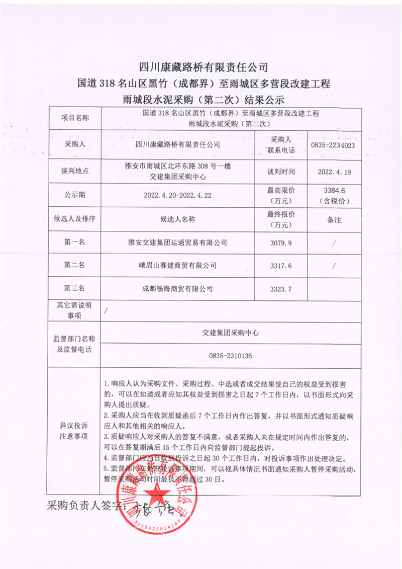 四川康藏路橋有限責任公司國道318名山區(qū)黑竹(成都界)至雨城區(qū)多營段改建工程雨城段水泥采購(第二次)結果公示