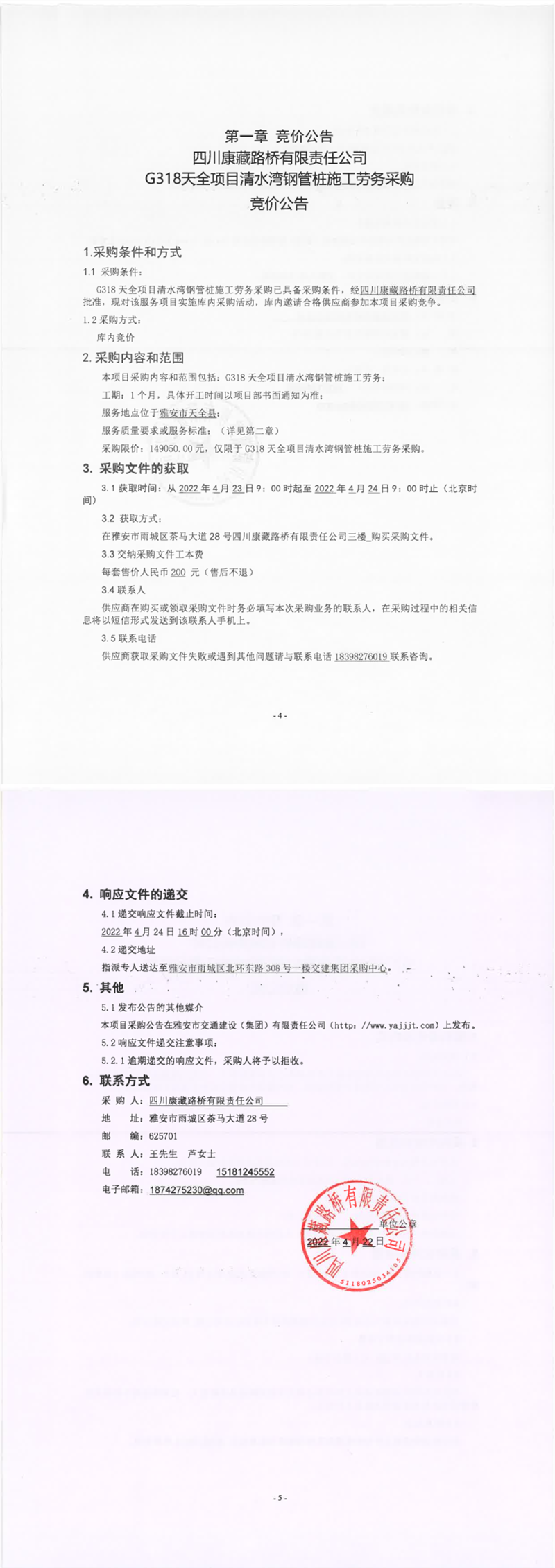 四川康藏路橋有限責任公司G318天全項目清水灣鋼管樁施工勞務(wù)采購競價公告