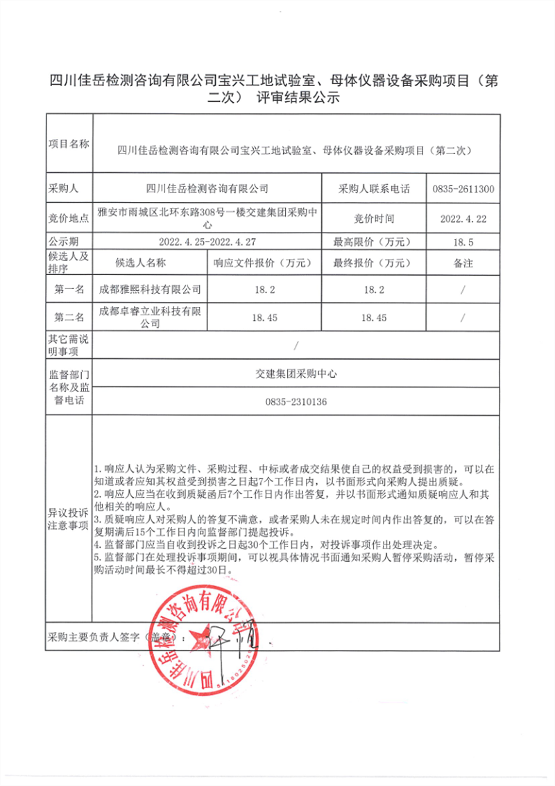 四川佳岳檢測咨詢有限公司寶興工地試驗室、母體儀器設備采購項目(第二次)評審結果公示