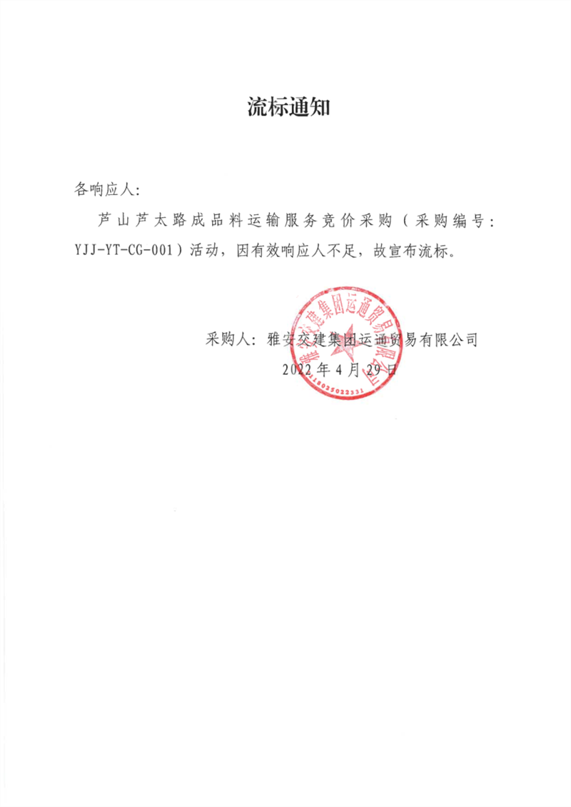 雅安交建集團(tuán)運通貿(mào)易有限公司蘆山蘆太路成品料運輸服務(wù)競價采購流標(biāo)通知
