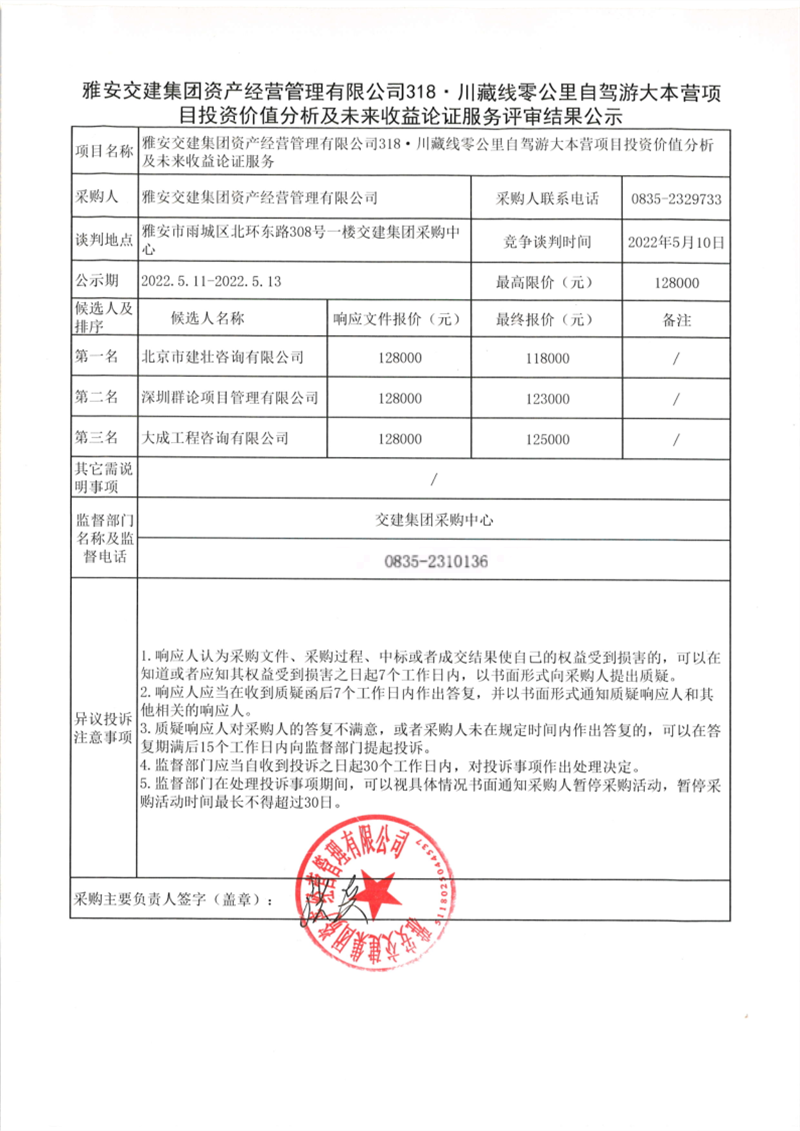 雅安交建集團資產(chǎn)經(jīng)營管理有限公司318·川藏線零公里自駕游大本營項目投資價值分析及未來收益論證服務評審結果公示