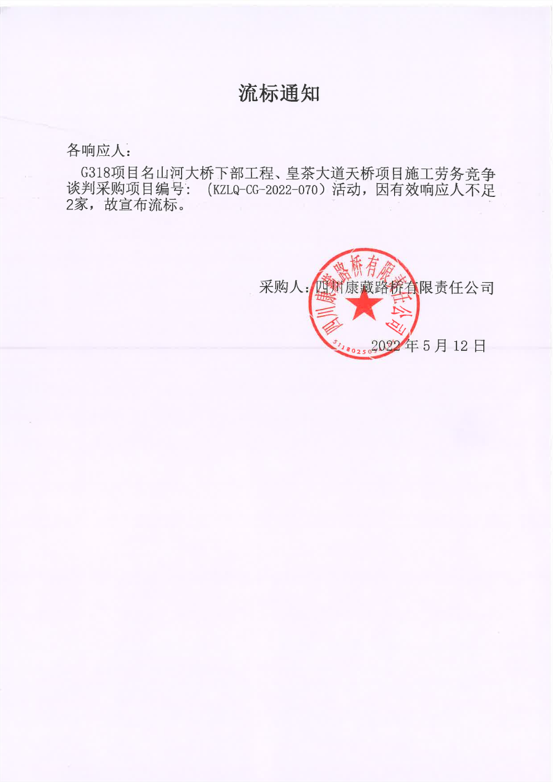 四川康藏路橋有限責任公司G318項目名山河大橋下部工程、皇茶大道天橋項目施工勞務(wù)談判采購項目流標通知