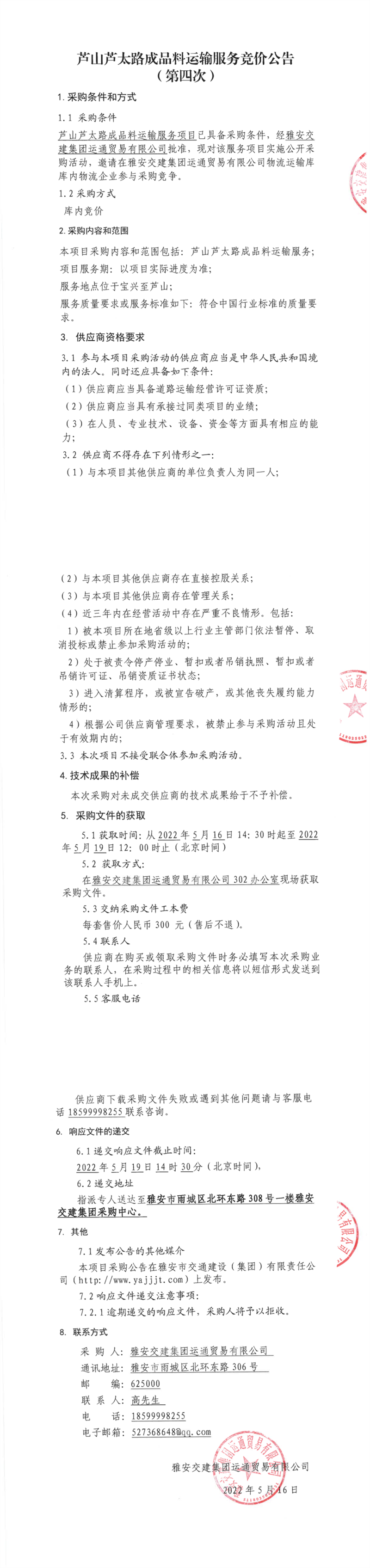 雅安交建集團運通貿(mào)易有限公司蘆山蘆太路成品料運輸服務(wù)競價公告(第四次)