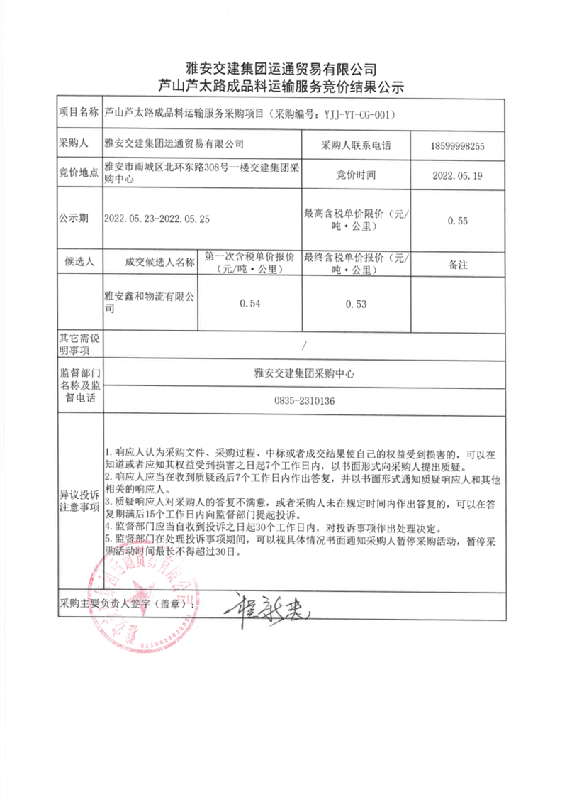 雅安交建集團運通貿(mào)易有限公司蘆山蘆太路成品料運輸服務(wù)競價結(jié)果公示