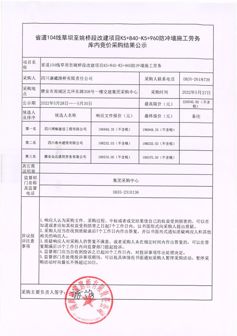 四川康藏路橋有限責(zé)任公司省道104線草壩至姚橋段改建項(xiàng)目K5+840-K5+960防沖墻施工勞務(wù)庫內(nèi)競(jìng)價(jià)采購結(jié)果公示