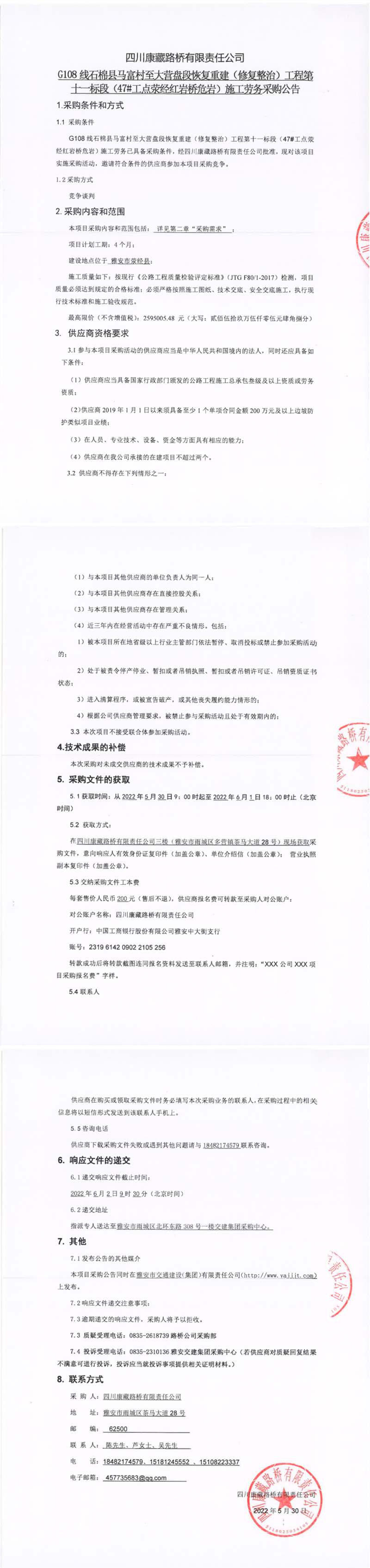 四川康藏路橋有限責(zé)任公司G108線石棉縣馬富村至大營(yíng)盤段恢復(fù)重建(修復(fù)整治)工程第十一標(biāo)段(47#工點(diǎn)滎經(jīng)紅巖橋危巖)施工勞務(wù)采購公告