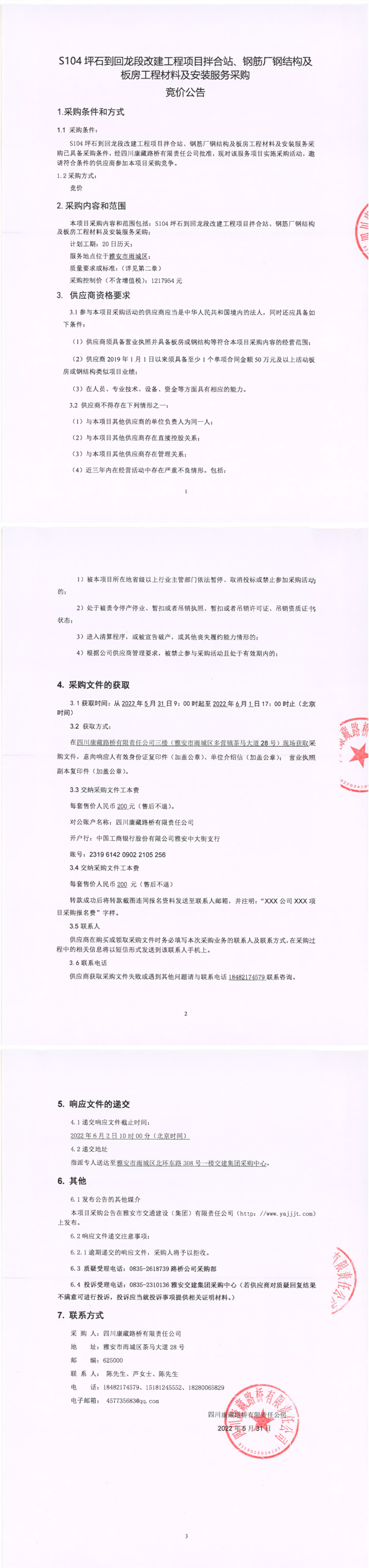 四川康藏路橋有限責(zé)任公司S104坪石到回龍段改建工程項(xiàng)目拌合站、鋼筋廠鋼結(jié)構(gòu)及板房工程材料及安裝服務(wù)采購競(jìng)價(jià)公告