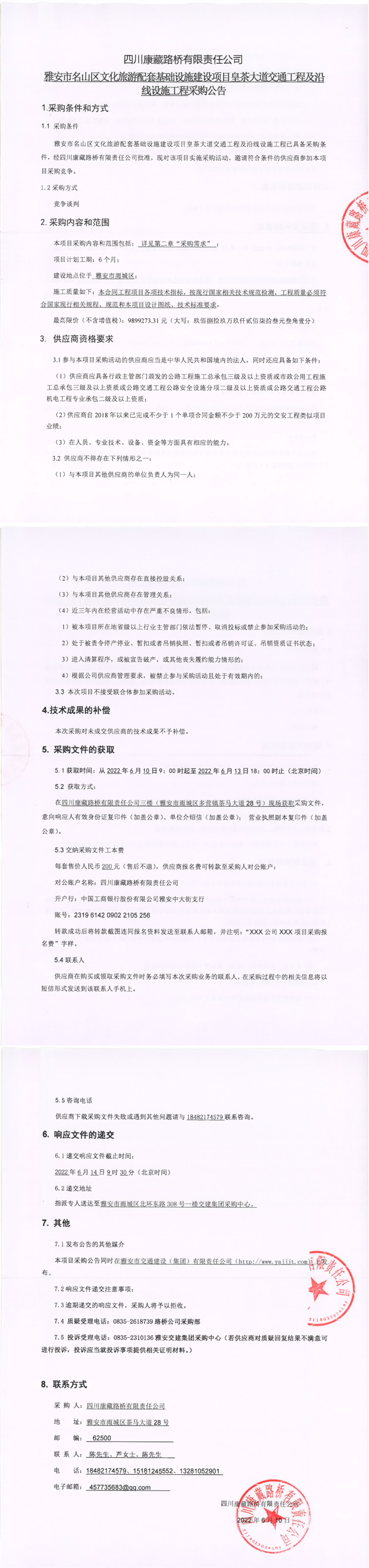 四川康藏路橋有限責任公司雅安市名山區(qū)文化旅游配套基礎(chǔ)設(shè)施建設(shè)項目皇茶大道交通工程及沿線設(shè)施工程采購公告