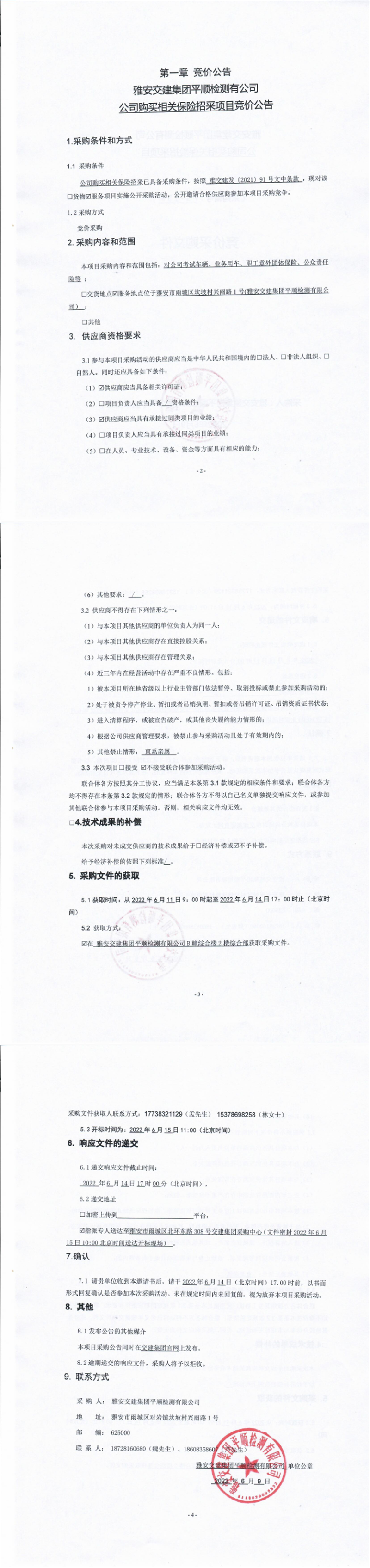 雅安交建集團平順檢測有限公司公司購買相關(guān)保險招采項目競價公告