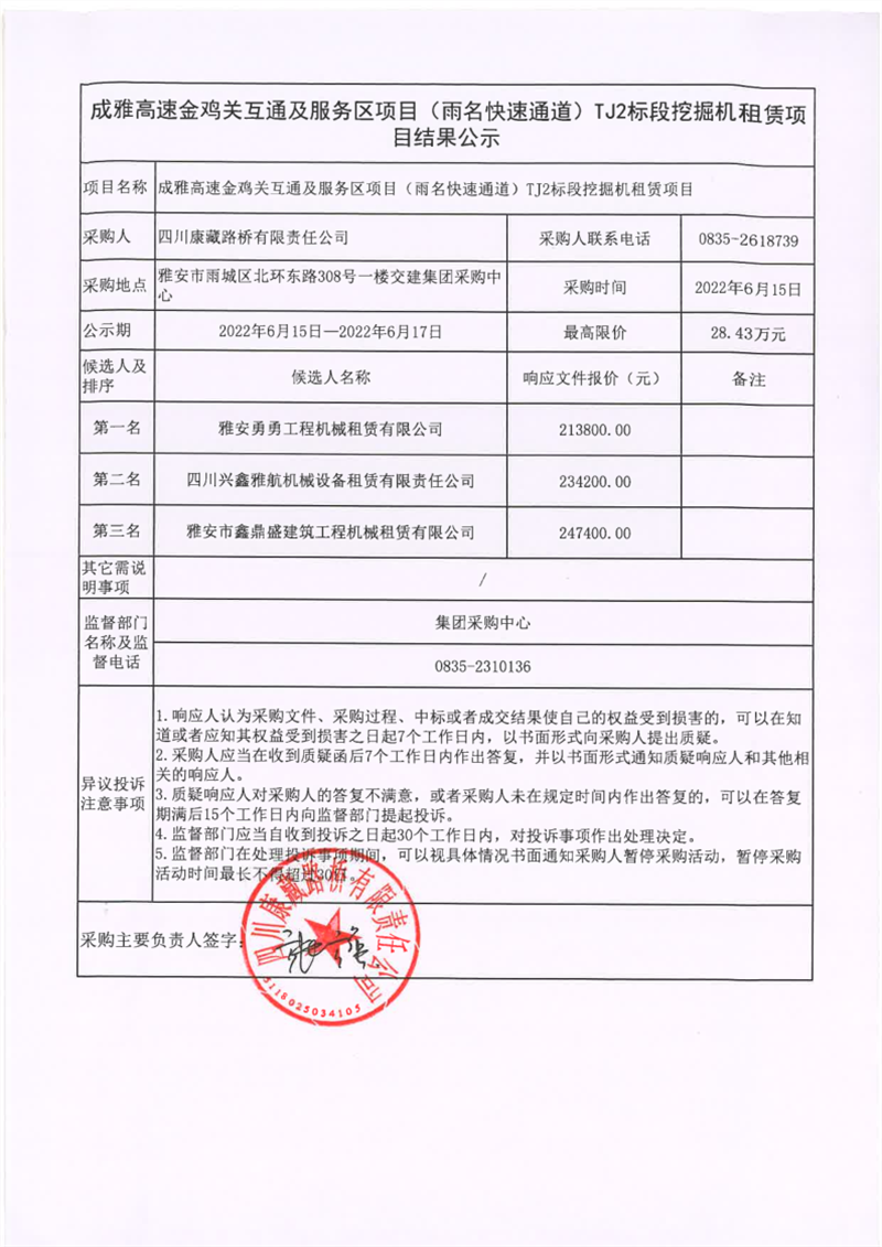 四川康藏路橋有限責任公司成雅高速金雞關(guān)互通及服務區(qū)項目(雨名快速通道)TJ2標段挖掘機租賃項目結(jié)果公示