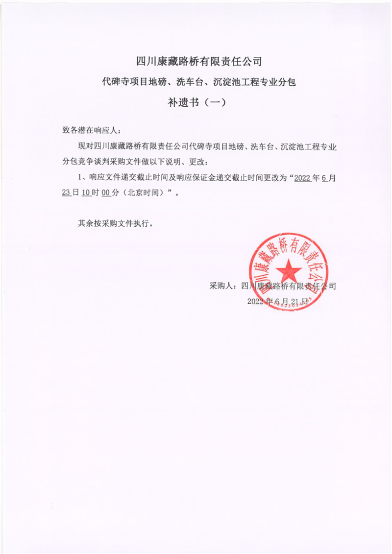 四川康藏路橋有限責任公司代碑寺項目地磅、洗車臺、沉淀池工程專業(yè)分包補遺書(一)