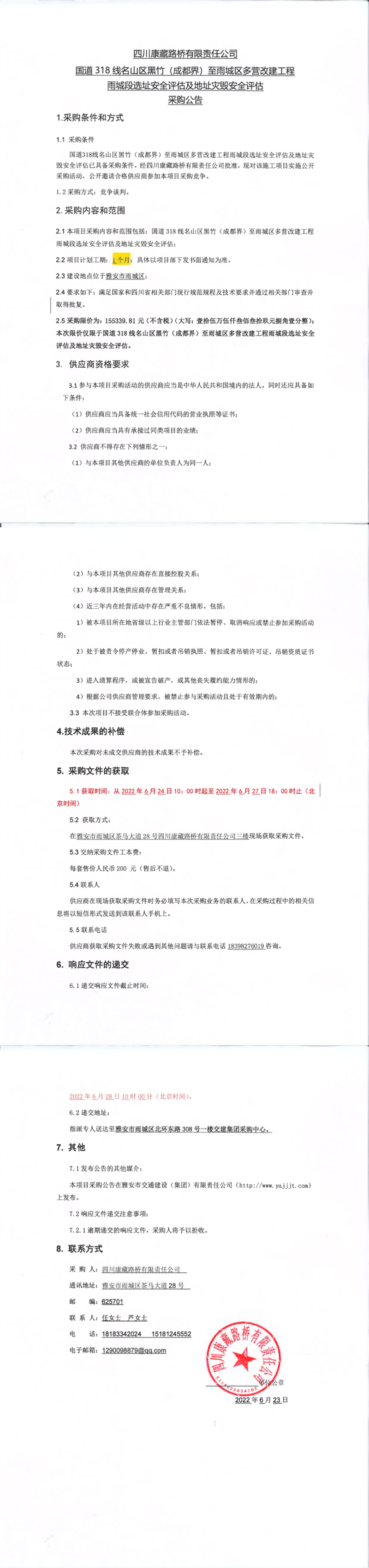四川康藏路橋有限責(zé)任公司國(guó)道318名山區(qū)黑竹(成都界)至雨城區(qū)多營(yíng)段改建工程雨城段選址安全評(píng)估及地址災(zāi)毀安全評(píng)估采購(gòu)公告