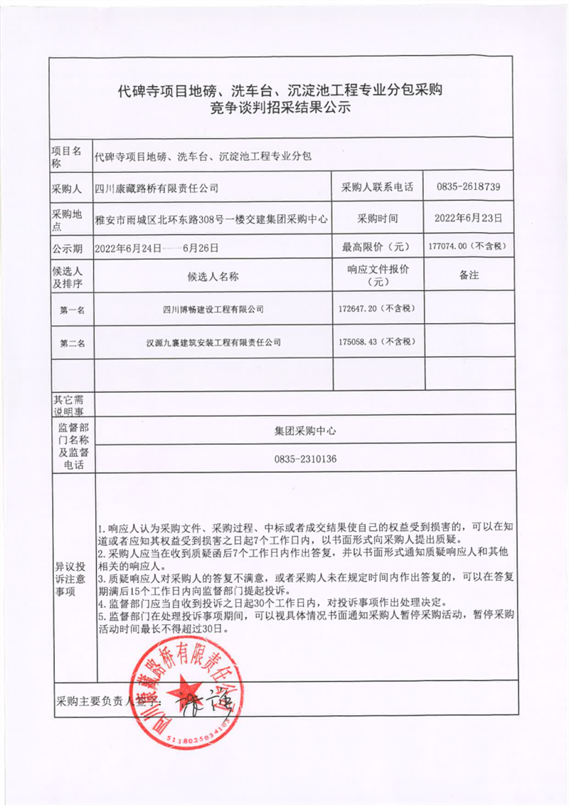 四川康藏路橋有限責任公司代碑寺項目地磅、洗車臺、沉淀池工程專業(yè)分包采購競爭談判招采結(jié)果公示