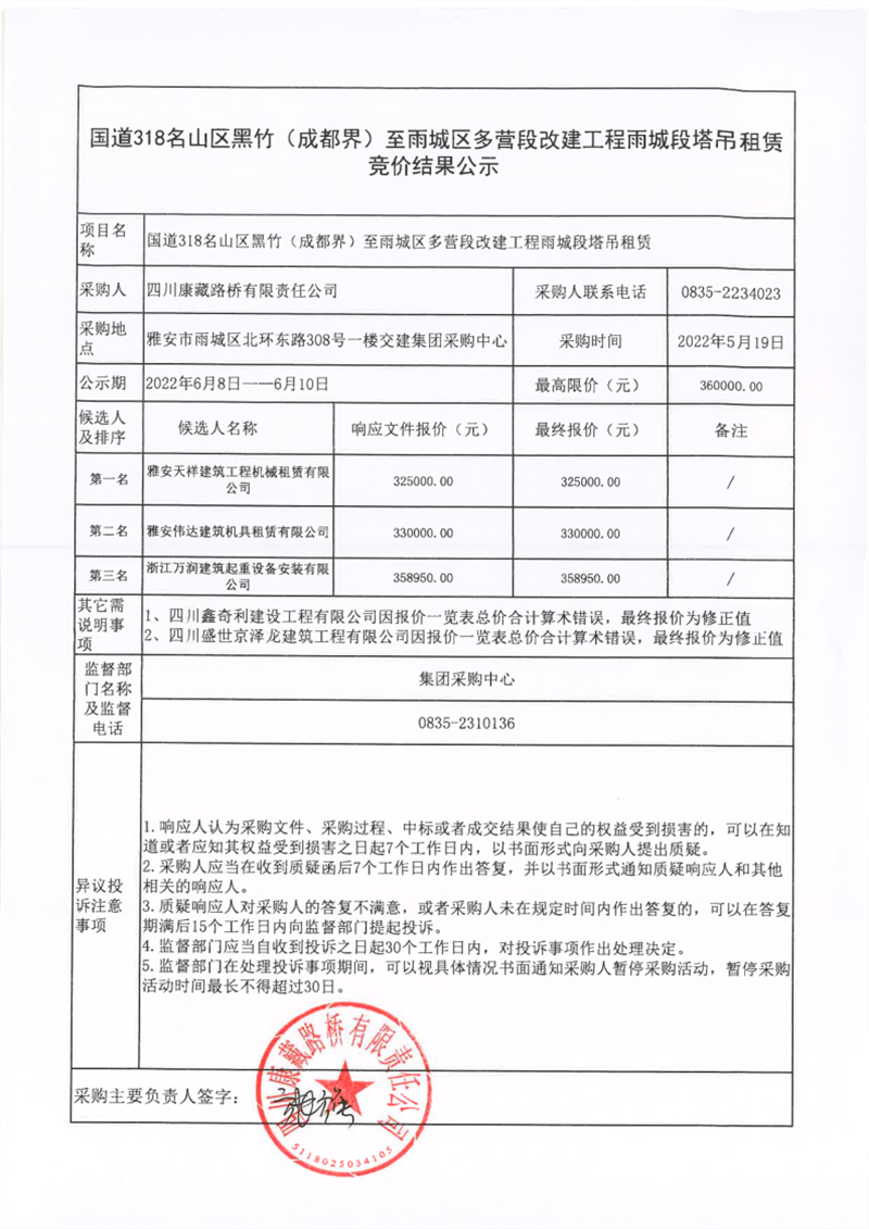 四川康藏路橋有限責(zé)任公司國(guó)道318名山區(qū)黑竹(成都界)至雨城區(qū)多營(yíng)段改建工程雨城段塔吊租賃競(jìng)價(jià)結(jié)果公示