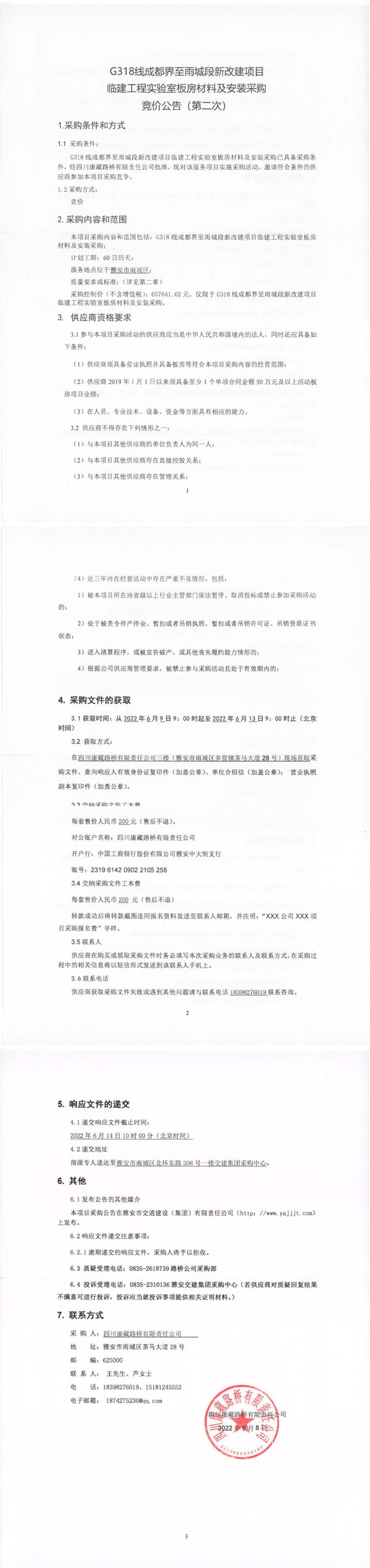 四川康藏路橋有限責(zé)任公司G318線(xiàn)成都界至雨城段新改建項(xiàng)目臨建工程實(shí)驗(yàn)室板房材料及安裝采購(gòu)競(jìng)價(jià)公告(第二次)