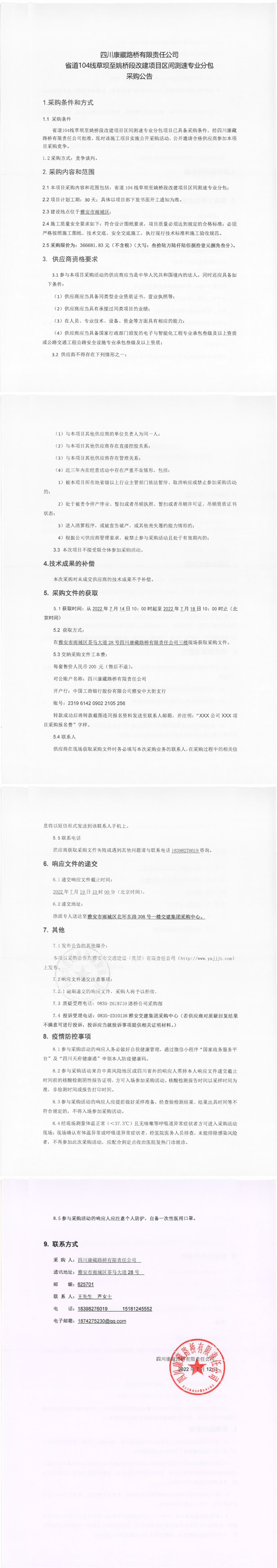四川康藏路橋有限責任公司省道104線草壩至姚橋段改建項目區(qū)間測速專業(yè)分包采購公告
