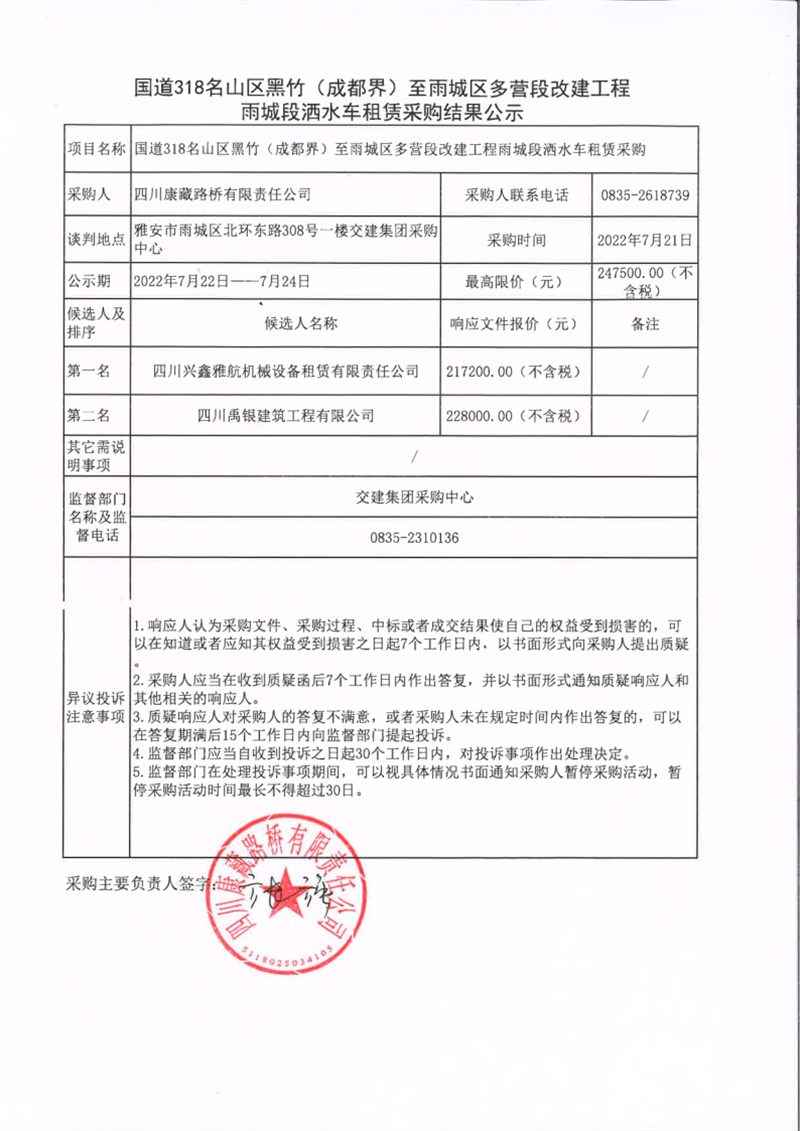 四川康藏路橋有限責任公司國道318名山區(qū)黑竹(成都界)至雨城區(qū)多營段改建工程雨城段灑水車租賃采購結(jié)果公示