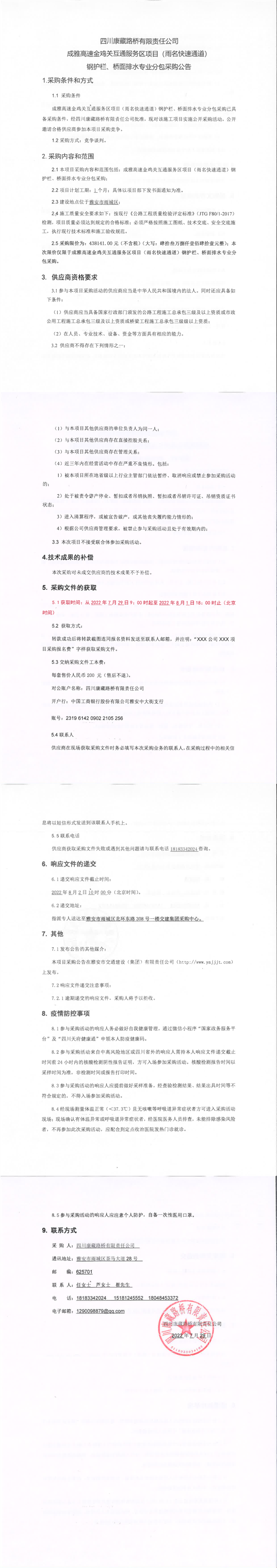 四川康藏路橋有限責(zé)任公司成雅高速金雞關(guān)互通服務(wù)區(qū)項目(雨名快速通道)鋼護欄、橋面攔水專業(yè)分包采購公告