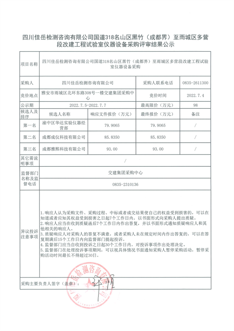 四川佳岳檢測(cè)咨詢有限公司國道318名山區(qū)黑竹(成都界)至雨城區(qū)多營段改建工程試驗(yàn)室儀器設(shè)備采購評(píng)審結(jié)果公示