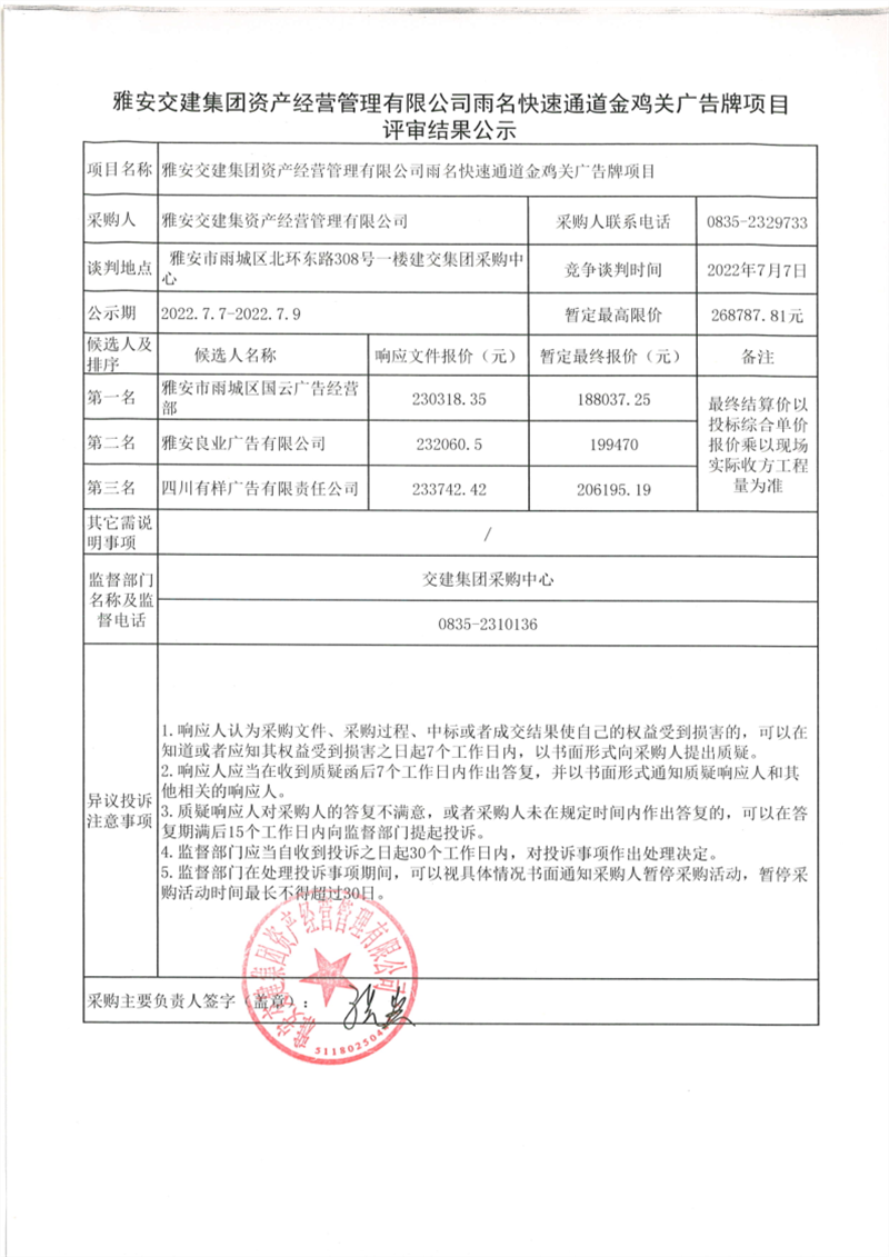 雅安交建集團(tuán)資產(chǎn)經(jīng)營(yíng)管理有限公司雨名快速通道金雞關(guān)廣告牌項(xiàng)目評(píng)審結(jié)果公示