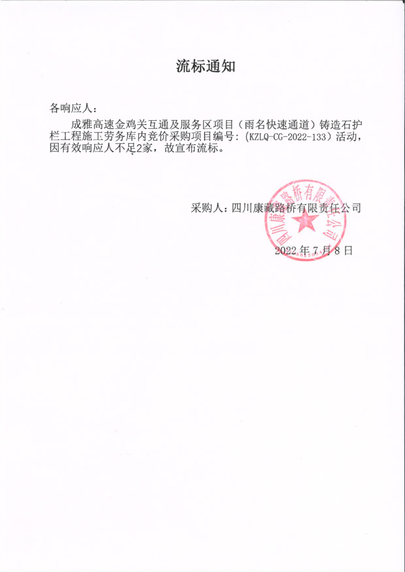 四川康藏路橋有限責(zé)任公司成雅高速金雞關(guān)互通及服務(wù)區(qū)項(xiàng)目(雨名快速通道)鑄造石護(hù)欄施工勞務(wù)庫(kù)內(nèi)競(jìng)價(jià)采購(gòu)項(xiàng)目流標(biāo)通知