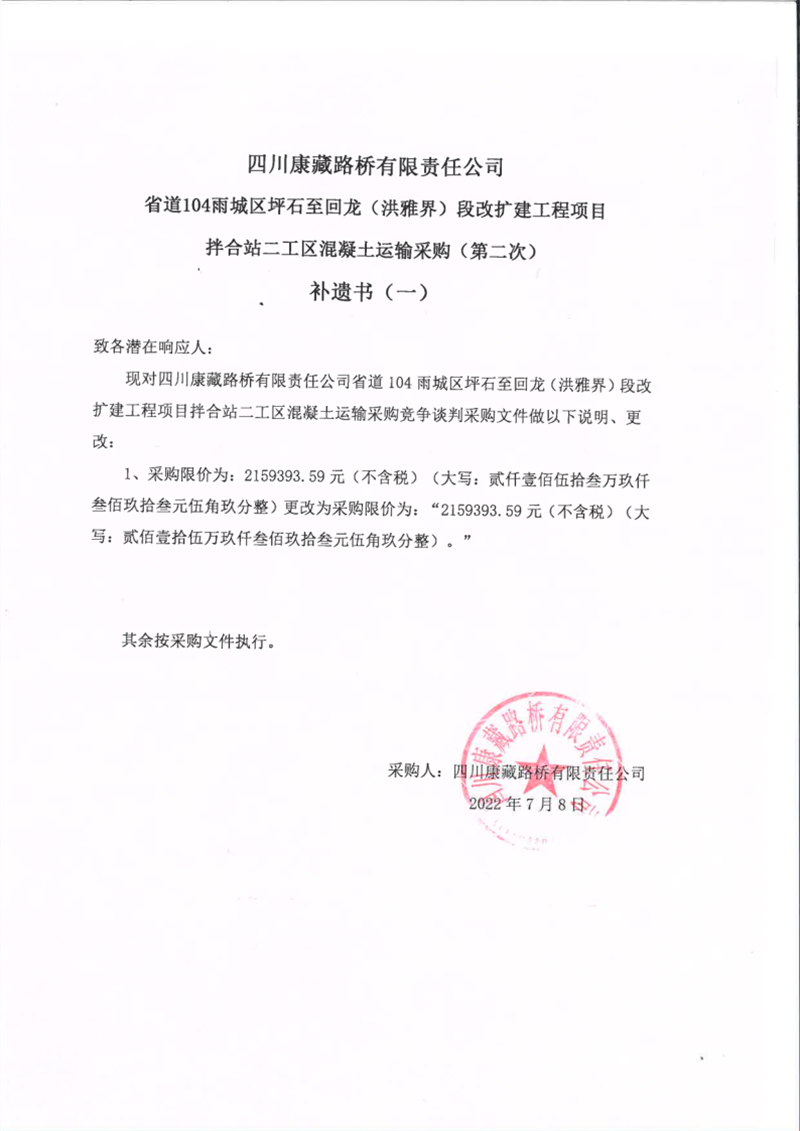 四川康藏路橋有限責(zé)任公司省道104線雨城區(qū)坪石至回龍(洪雅界)段改建工程項(xiàng)目拌合站二工區(qū)混凝土運(yùn)輸采購(第二次)補(bǔ)遺書(一)
