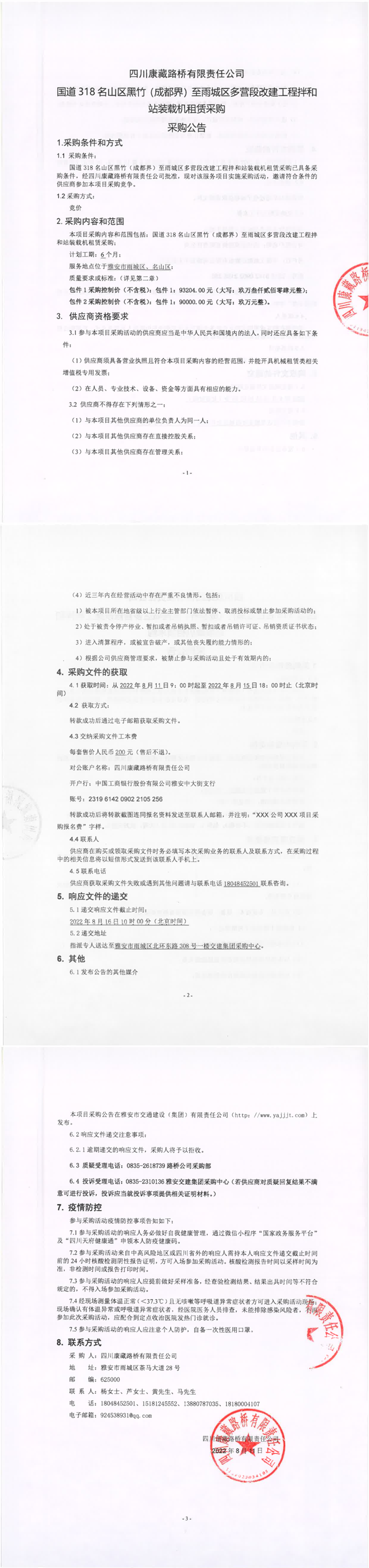 四川康藏路橋有限責任公司國道318名山區(qū)黑竹(成都界)至雨城區(qū)多營段改建工程拌和站裝載機租賃采購公告