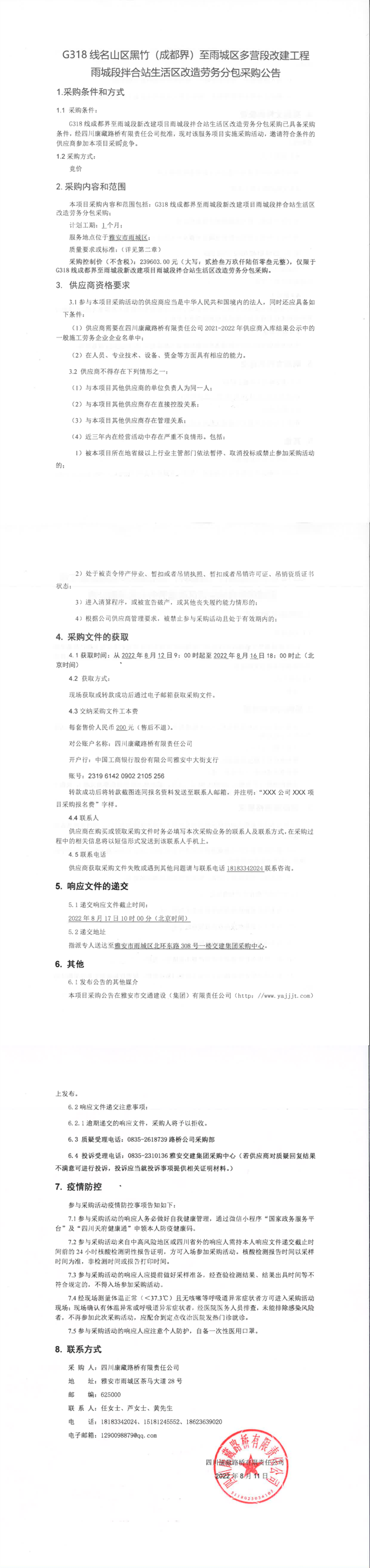 四川康藏路橋有限責(zé)任公司G318線名山區(qū)黑竹(成都界)至雨城區(qū)多營(yíng)段改建工程雨城段拌合站生活區(qū)改造勞務(wù)分包采購(gòu)公告