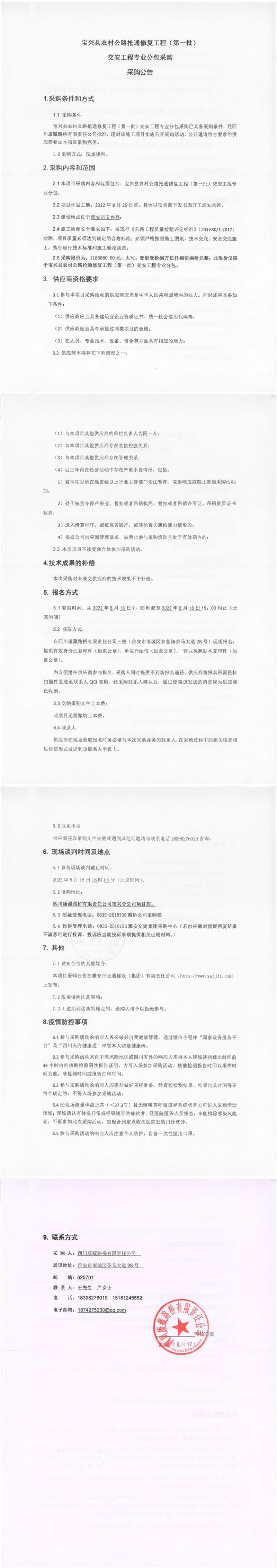 四川康藏路橋有限責(zé)任公司寶興縣農(nóng)村公路搶通修復(fù)工程(第一批)交安工程專(zhuān)業(yè)分包采購(gòu)采購(gòu)公告