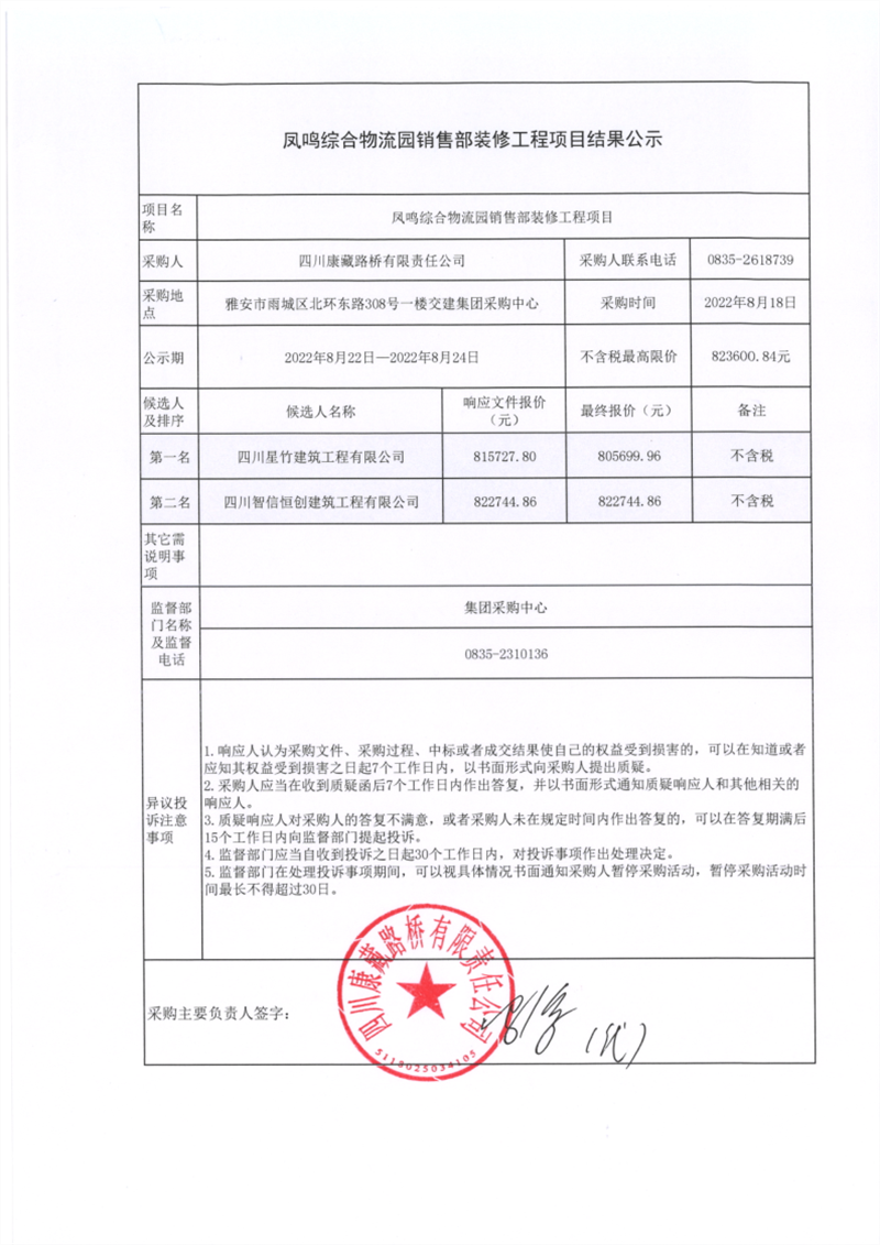 四川康藏路橋有限責任公司鳳鳴綜合物流園銷售部裝修工程項目結(jié)果公示