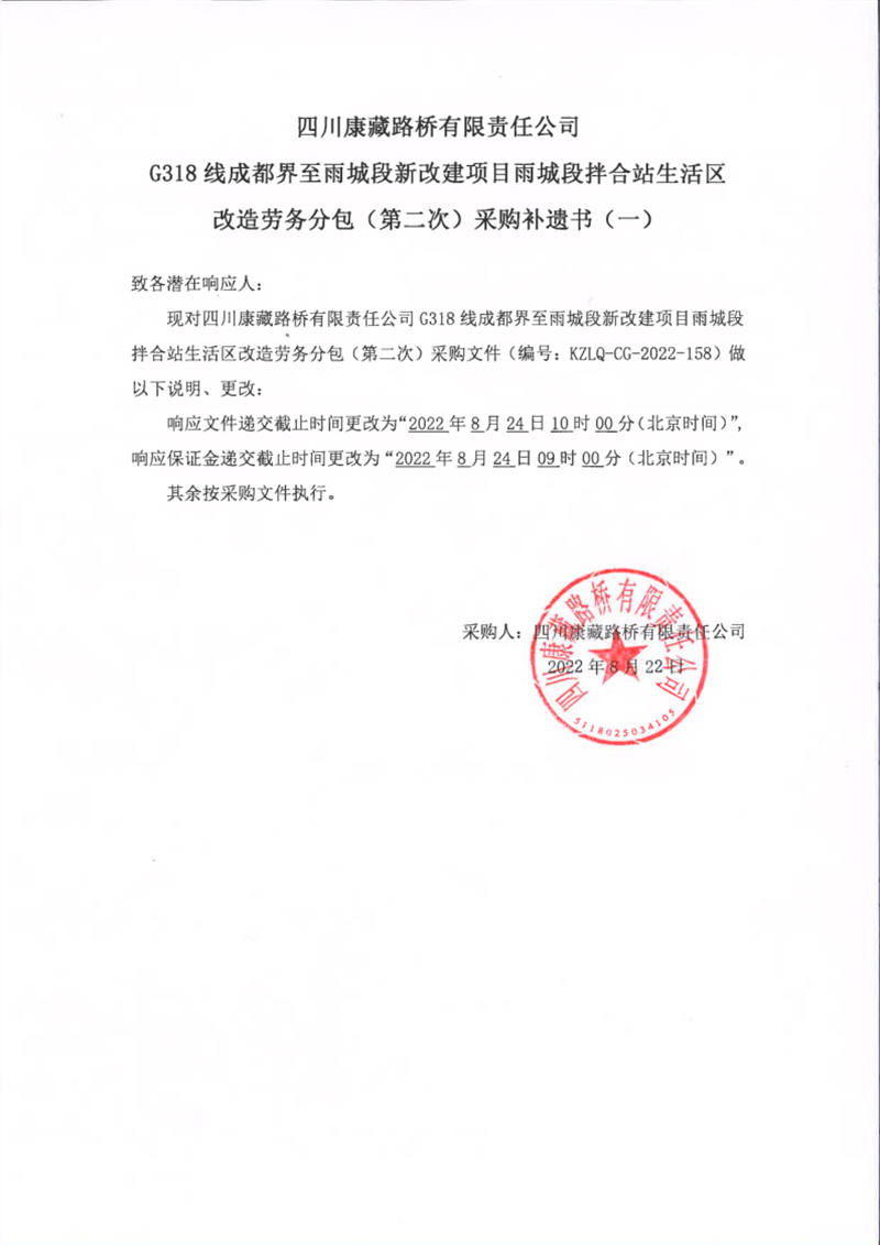 四川康藏路橋有限責(zé)任公司G318線成都界至雨城段新改建項(xiàng)目雨城段拌合站生活區(qū)改造勞務(wù)分包(第二次)采購補(bǔ)遺書(一)
