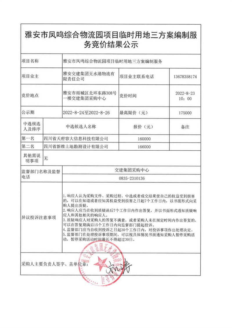 雅安交建集團無水港物流有限責任公司雅安市鳳鳴綜合物流園項目臨時用地三方案編制服務(wù)競價結(jié)果公示