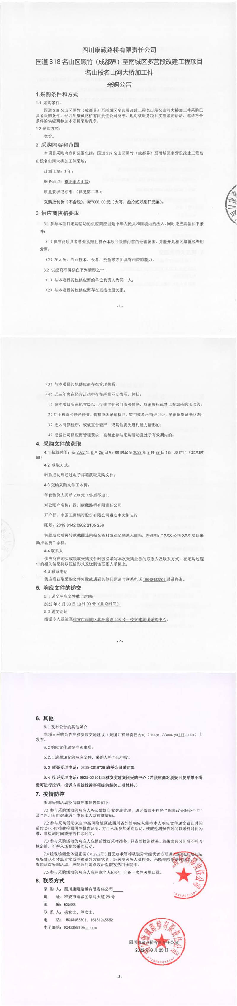 四川康藏路橋有限責(zé)任公司國道318名山區(qū)黑竹(成都界)至雨城區(qū)多營段改建工程項(xiàng)目名山段名山河大橋加工件采購公告