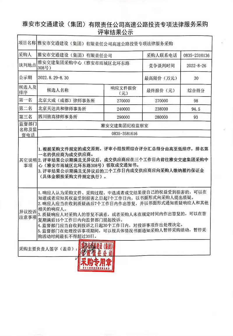雅安市交通建設(shè)(集團(tuán))有限責(zé)任公司高速公路投資專項(xiàng)法律服務(wù)采購(gòu)評(píng)審結(jié)果公示