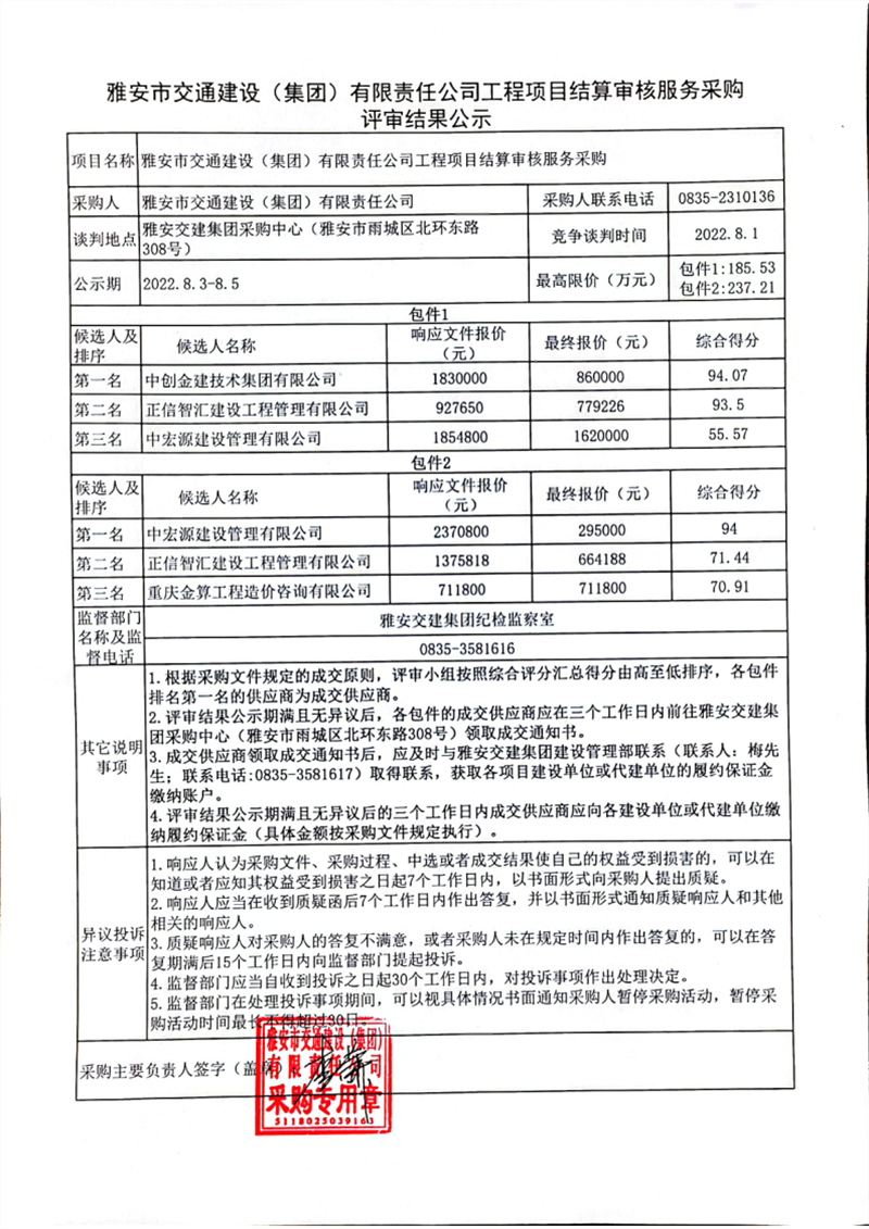 雅安市交通建設(集團)有限責任公司工程項目結算審核服務采購評審結果公示
