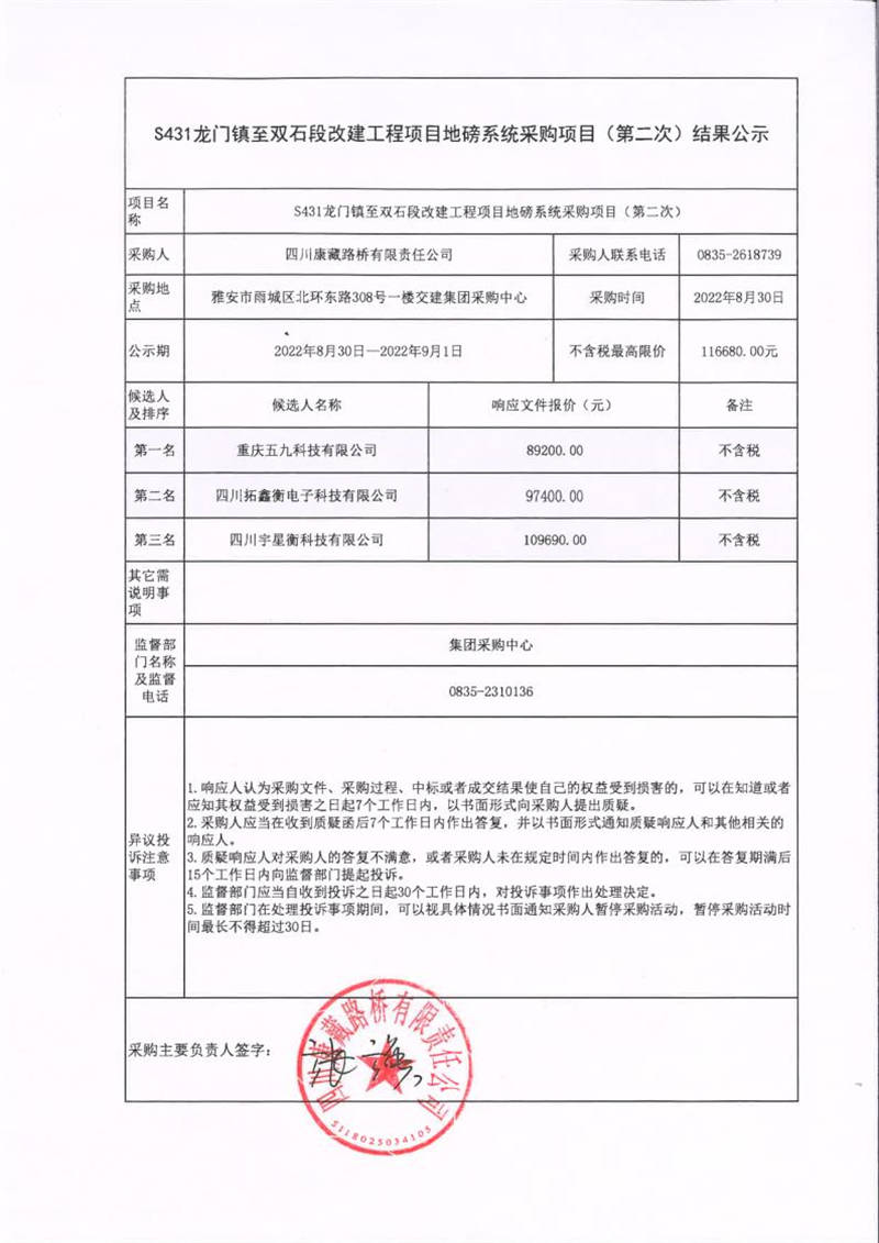 四川康藏路橋有限責任公司S431龍門鎮(zhèn)至雙石段改建工程項目地磅系統(tǒng)采購項目(第二次)結果公示