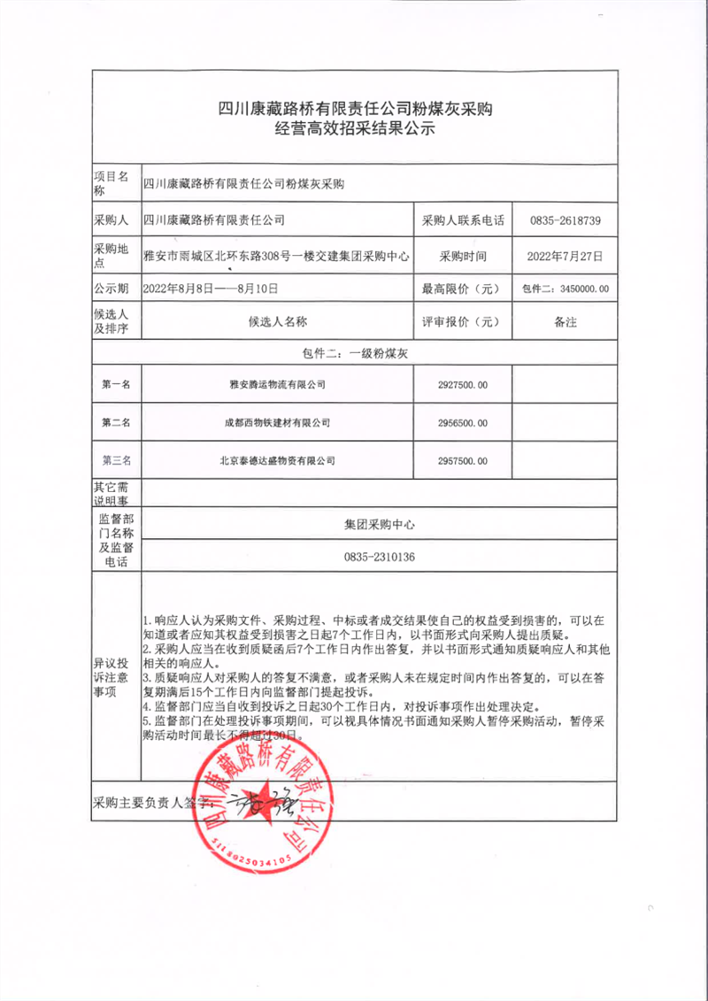 四川康藏路橋有限責(zé)任公司粉煤灰采購經(jīng)營高效招采結(jié)果公示